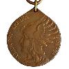 Круглая медаль из стали (белая металлическая или бронзовая посеребренная) сверху имеет уширение края с отверстием для размещения небольшого кольца, на нем ленточное кольцо.