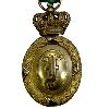 Бронзовая круглая медаль со ступенчатой каймой. Сверху более широкое ушко с ленточным кольцом.