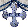 Крест из золотой бронзы в виде Железного креста. Передняя и задняя части с круглым центральным экраном. Крестообразные плечи окаймлены полированными краями, к которым примыкает рифленый край. Внутренние стороны крестовин гладкие. На верхнем крестообразном плече ушко с бандажным кольцом.