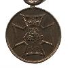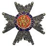 Золотой крест мальтийской формы с маленькими шариками на кончиках крестовин. Крестообразные руки бордовые золотистые и эмалированные белого цвета. Передняя и задняя стороны с накладным медальоном. Между крестовыми рукавами, соответственно, спаянная, ажурная королевская корона. Между кончиками верхнего крестообразного плеча широкое, бороздчатое ушко. В этом маленькое кольцо и двойное удлиненное ленточное кольцо.