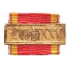 Круглая медаль из позолоченной бронзы с приподнятой каймой. Сверху припаянное обычное ушко с ленточным кольцом.