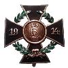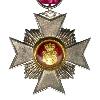 Серебряный крест в мальтийской форме. Между крестообразными плечами по 7 ступенчатых лучей. Крестообразные рукава с узким, приподнятым, гладким краем мелко зернистые внутри. Передняя и задняя стороны с накладным золотым и эмалированным медальоном. Через центр скрещены 2 меча, эти односторонне выбитые на лицевой стороне над лучами. Между кончиками верхнего крестообразного плеча орнаментированный аграф с ушком и ленточным кольцом.