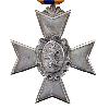 Восьмиконечный крест из серебра с полированными краями. Внутренние стороны крестообразных рукавов мелкозернистые. Передняя и задняя стороны с рельефным, позолоченным и эмалированным, овальным медальоном. Через центр проходят 2 скрещённых, позолоченных меча. На верхнем крестообразном плече между кончиками орнаментированный аграф с бугристым ушком, через который проходит ленточное кольцо.