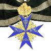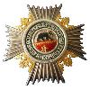 Восьмиконечный крест из золота с маленькими шариками на вершинах. Крестовые рычаги обшиты золотом, а внутренние - белой эмалью. Между крестовыми рукавами по 3 золотых сильных, золотых луча. На лицевой стороне большой круглый медальон. Задняя сторона центральная с большим изогнутым гербовым щитом. Между шарами верхнего крестообразного плеча припаянная 5-бугристая, открытая, золотая корона. Через имперское яблоко короны проходит кольцо.