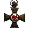 Серебряный восьмиконечный крест с белыми эмалированными крестовыми рукавами, серебристый бордовый. Реверс гладкий серебристый с вертикальной булавкой с ответным крючком. Центр увеличен и усилен.