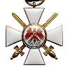 Золотой крест с белыми эмалированными крестовыми рукавами. В крестообразных рукавах на расстоянии внутри золотой тонкий ободок. Передняя и задняя стороны с наложенным круглым медальоном. Сверху припаянное поперечно стоящее ушко для удлиненного ленточного кольца. На нижнем крестообразном плече метка зубца - W - (Вагнер).