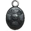 Круглая медаль из серебра с приподнятой каймой. Сверху припаянное обычное ушко с ленточным кольцом.