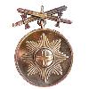 Восьмиконечный крест из позолоченного серебра. Крестообразные руки покрыты золотом. Внутренние стороны эмалированные. Спереди и сзади с надетым золотым медальоном. Между вершинами верхнего крестообразного плеча параллельно стоящее небольшое ушко с ленточным кольцом.
