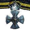 Большая 8-лучевая звезда из серебра. Отдельные лучи состоят из 7 отдельных лучей. Они расположены в центре. Средний луч самый длинный. В центре положен круглый, золотой, эмалированный медальон. Под ним по диагонали положены 2 золотых античных меча. Сверху на медальон надета золотая корона (18 х 19 мм). Сзади вертикальная булавка.