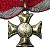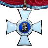 Золотой крест со слегка фигурными крестовыми концами. Крестовые руки обшиты золотом и эмалированы белым. Спереди и сзади с наложенным круглым, золотым и эмалированным центральным щитом. Через центр скрещены 2 древних, золотых меча. На верхнем крестообразном плече параллельное ушко. Через них проходит удлиненное двойное ленточное кольцо.