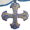 Восьмиконечный крест из серебра. Между поперечными плечами по ромбу. Центральный, с лицевой стороны надставленный круглый медальон медальона. Упоры завинчены 8 раз. Задняя часть с двойной булавкой и 2 крючком. Центральная крышка с обозначением производителя.