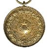 Серебряная медаль с каймой. Сверху припаянное ушко, в которое подвешены скрещенные мечи. В центре серебряных мечей маленькое ушко с ленточным кольцом.
