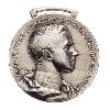 Серебряная медаль с приподнятой, ступенчатой каймой. Сверху имеется широкий проушин, через который тянется лента.