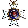 Крест из позолоченной бронзы. Поперечные рычаги прямые и слегка сварные только на концах. Гладкие поперечные рычаги окантованы 2 линиями по краям. Гладкая задняя сторона с вертикальной булавкой.