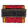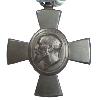 Серебряный крест с закруглёнными концами крестовины. Края крестовин приподняты и полированы. Внутренности мелко изрезаны. Спереди и сзади с надетым круглым медальоном. На верхнем крестообразном рукаве орнаментированный аграф. В него вмонтировано ленточное кольцо с прикреплённым к нему небольшим кольцом. В медальном цилиндре - G.H. 900 - для гебр. хеммерле и серебряного пунца.
