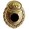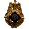 Высокий овальный посеребренный значок из цветного металла, ажурная работа. Орёл отчеканен отдельно и приклёпан к краю. Сзади вертикальная булавка.