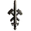 Круглый, ажурный знак из посеребренного железа или цветного металла. Сзади вертикальная булавка.