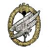 Крест из посеребренного цветного металла в мальтийской форме. Поперечные рычаги с гладкой, полированной, приподнятой кромкой. Внутренности мелко изрезаны. Между крестовыми рукавами соответственно летящий вправо орёл люфтваффе с распростёртыми крыльями, в лапах свастика, поставленная на острие. За орлами через центр скрещены 2 меча. Центральный круглый щит (16 мм). Сзади вертикальная булавка.