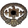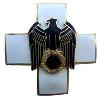 Крест из медного сплава с матовым серебром. Крестовины на концах закруглены и имеют широкие полированные края с внутренней декоративной линией. Внутренние стороны крестовых рукавов зернистые. В центре большой круглый центральный щит. Между крестовыми рукавами дубово-лиственный венок из 2 рядов листьев. Сверху припаянное ушко с ленточным кольцом. Задняя сторона гладкая и посеребренная.