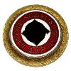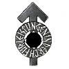 Удлинённая, позолоченная и спереди синяя эмалированная застёжка из цветного металла. На спине длинная, лежащая поперек булавка с ответными крючками. В центре - производитель.