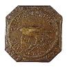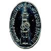 Круглый знак из цветного металла с тиснением полой формы. По краям 4 на 2 небольшие отверстия, равномерно распределенные, для сшивания.