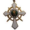 Удлинённый крест со слегка расширенными концами крестовины. Лицевая сторона эмалирована с надетым круглым медальоном в центре. На верхнем крестовом рукаве, припаянном по углам и центру, 2 скрещённых, серебряных меча. Они зажаты посередине, а проушина припаяна к кольцу ленты. Реверс без эмали с увеличенной надписью. Мечи гладкие сзади.