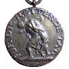 Крест из позолоченной бронзы в форме Женевского креста. Прямые крестообразные руки обшиты золотом и эмалированы белым. Передняя сторона с круглым, приподнятым средним щитом. На верхнем крестообразном плече вьющееся ушко с небольшим кольцом. Подвешено удлиненное сверху расширяющееся ленточное кольцо.