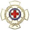 Позолоченный, рельефный крест из цветного металла. По центру спереди и сзади круглый медальон. Через середину скрещены 2 меча. Крестовины на концах с треугольной выпуклостью посередине. Крестообразные руки окружены приподнятой рифлёной каймой. Внутренние поверхности крестообразных плеч мелкозернистые. Сверху припаянное ушко с ленточным кольцом.