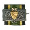 Высокий овальный знак с узкой приподнятой каймой из постаревшего серебра. Сзади вертикальная булавка.