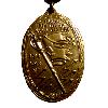 Овальная медаль из позолоченной бронзы с каймой. Сверху припаянное обычное ушко с ленточным кольцом.