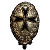 Овальная медаль из золотой бронзы. Сверху отверстие с небольшим кольцом и ленточным кольцом.