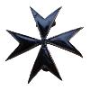 Серебряный или посеребренный, удлинённый узловатый крест с белыми эмалированными заострёнными крестообразными рукавами. На кончиках 8 маленьких серебряных шариков. В центре - круглый медальон. Через центр скрещены 2 древних меча.