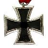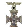 Крест из медного цинка в виде 8-лучевого лучевого венца. В центре спереди расположен круглый щит. За щитом пересечены по центру 2 меча. Они перекрывают лучи. Верхняя балка удлиняется и сзади образует ушко, через которое проходит ленточное кольцо.