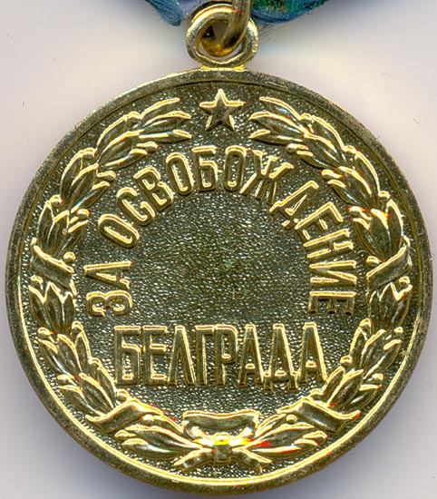 На оборотной стороне медали дата освобождения Белграда — “20 октября 1944”, над датой пятиконечная звездочка.