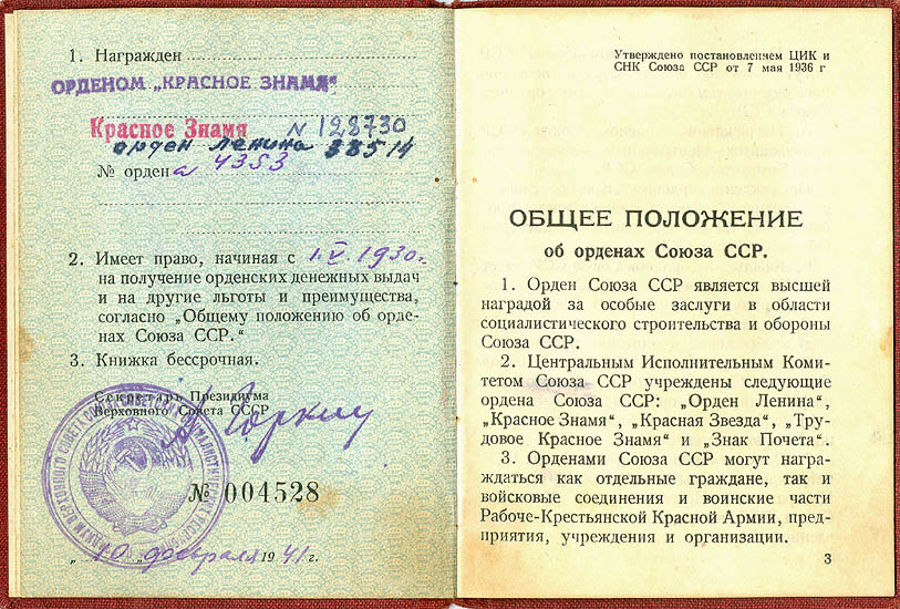 Перевыдача ордена Красного Знамени