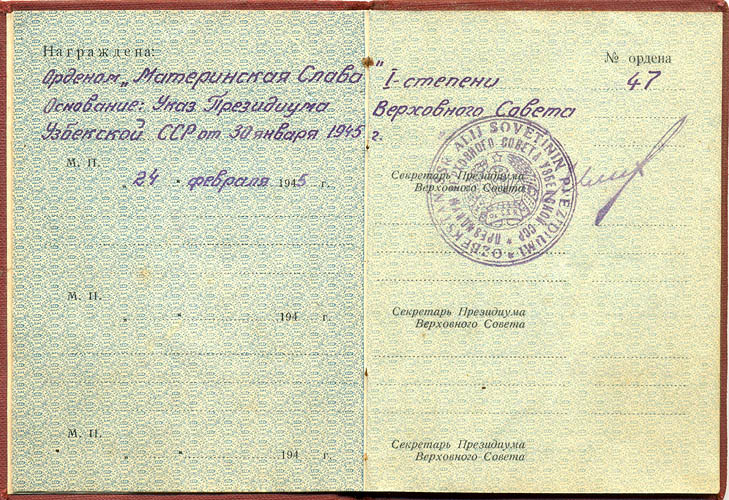 Орден “Материнская слава” был учрежден одновременно с орденом “Мать-Героиня” и медалью Материнства и занимал промежуточное положение между ними.