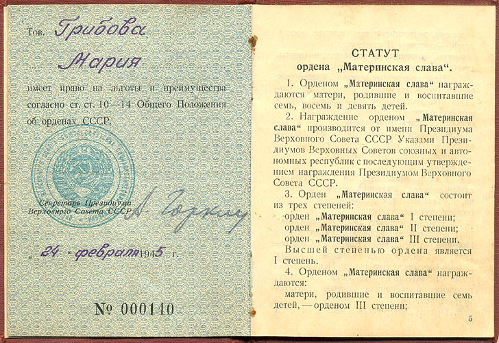 Награждение орденом “Материнская слава” производится от имени Президиума Верховного Совета СССР указами Президиумов Верховных Советов союзных и автономных республик.