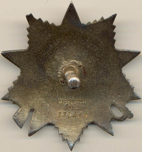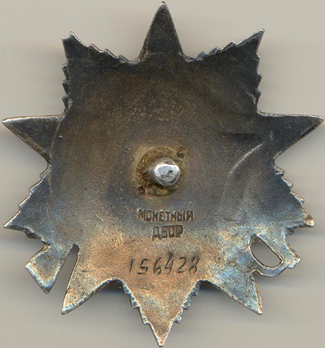 - Вариант 2. Изготовление орденов второго варианта ММД началось непосредственно после прекращения производства знаков первого варианта, номерной интервал не прерывался продукцией других предприятий. Ордена второго варианта изготавливались на ММД в первой половине 1944 года. Они имели особенный, отличающийся от прочих знаков, характер поверхности реверса. На реверсе располагалось кольцевидное, напоминающее канаву или траншею, углубление шириной около 4 мм. Из-за этого они получили у фалеристов прозвище «канава». Внутренняя граница углубления располагалась на расстоянии 6 мм от нарезного штифта. Клеймо монетного двора отсутствует, номер нанесен штихелем в нижней части реверса (на 6 часов по циферблату). Всего на ММД были изготовлены две партии подобных знаков. Необходимо отметить, что ордена с подобным реверсом в некотором количестве выпускались и на Ленинградском Монетном Дворе (ЛМД), о чем будет рассказано ниже (см. раздел ПРОДУКЦИЯ ЛМД).