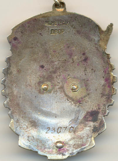 - Вариант 2. Клеймо Монетного Двора расположено в верхней части ордена. Слово «МОНЕТНЫЙ» закруглено вверх (впадиной). Аналогичный тип клейма использовался на последних штифтовых знаках второго типа. Минимальный известный номер 21016, максимальный — 26568.