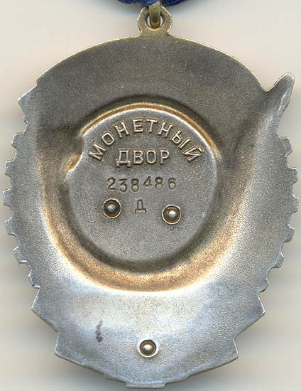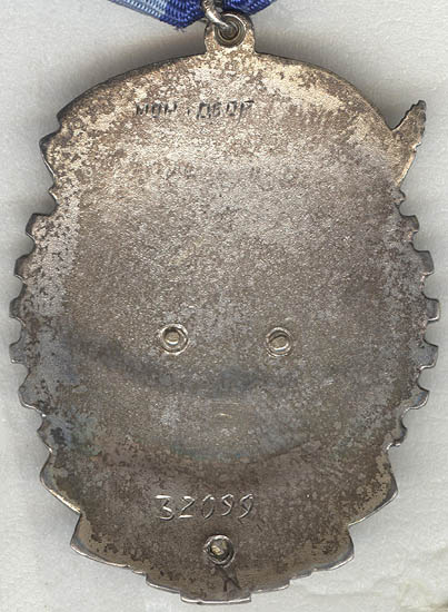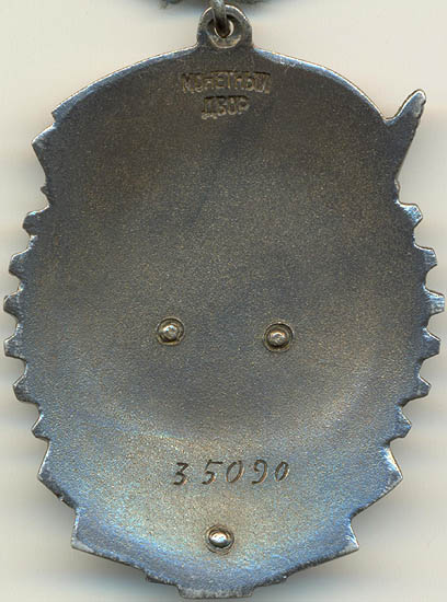 - Вариант 2. Углубление на реверсе имеет диаметр 25,5 мм. Расстояние между буквами клейма больше, чем у первого варианта. Минимальный известный номер ордена – 938, максимальный– 2748.