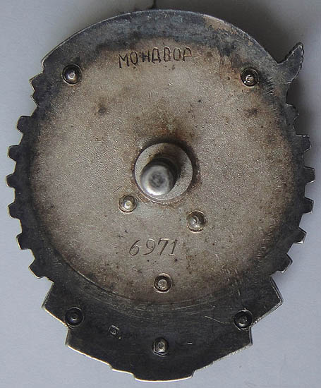 - Разновидность 2. Клеймо МОНДВОР нанесено пуансоном в верхней части ордена. Буквы в клейме крупные. Знаки данной разновидности можно встретить в двух номерных интервалах (или партиях). К первой партии относятся номера, выпускавшиеся параллельно с Разновидностью 1 (сразу после знаков первого варианта). Минимальный известный номер для первой партии — 7001, максимальный — 7603.