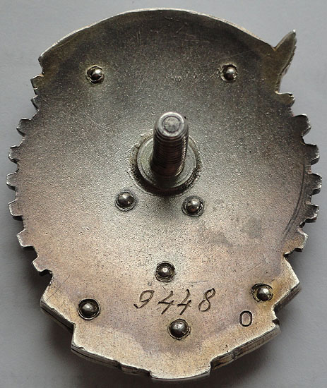 - Вариант 2. Нарезной штифт на реверсе ордена в своем основании имеет плоский одноступенчатый фланец. В зависимости от особенностей клейма, можно выделить следующие разновидности второго варианта.